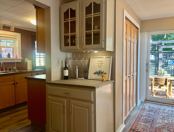 Inside you'll find two bedrooms, one with a queen and one with a full bed. (The living room sofa opens to a full bed should you need the extra space.) The dining room has a large table, plenty of room for games, dining, morning coffee, and a bar area for whipping up your favorite libations. A quick step outside the sliding doors and you're on the deck. Step down from the sunny dining room into a sunken living room where the family can gather for TV or to hash the day's events. A rear row of windows allows for lots of great light through the cottage all day.